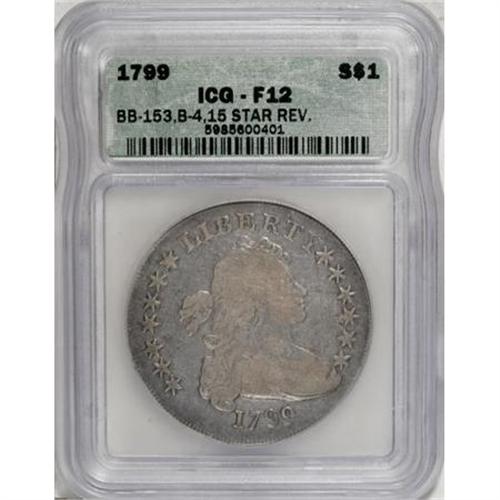 <B>1799 $1 Irregular Date, 15 Stars Reverse Fine 12 ICG.</B></I> B-4, BB-153, R.4. A very scarce variety distinguished by the 15 star reverse and the date with two off-kilter center digits. Despite significant wear, this Fine piece has a pleasing appearance and a strongly defined obverse. On each side, the fields have sky-blue patina, while the devices appear peach-gold.<BR><BR><B>Coin Engraver:</B> Robert Scot<BR><BR><b>Shipping:</b> Coins & Currency (<a target="_blank" href="http://www.heritageauctions.com/common/shipping.php">view shipping information</a>)