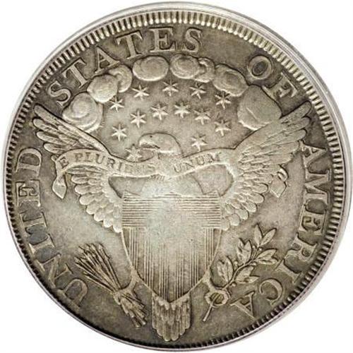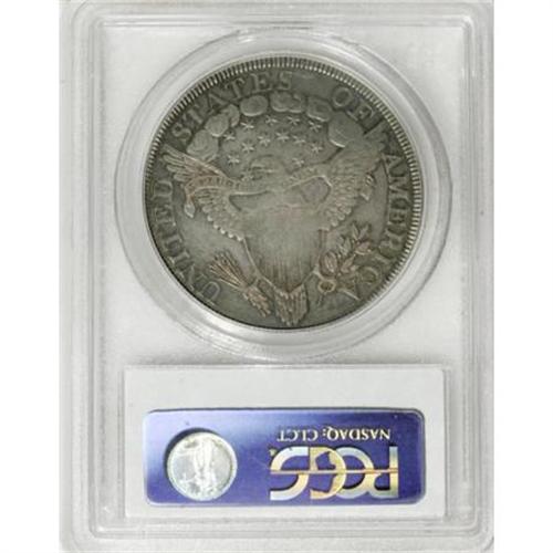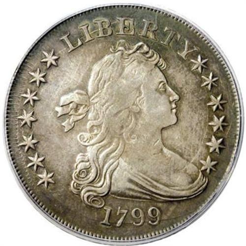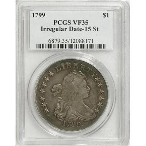 <B>1799 $1 Irregular Date, 15 Stars Reverse VF35 PCGS.</B></I> B-4, BB-153, R.4. The well-known blundered reverse with 15 stars instead of the traditional 13. The engraver tried to hide the error by enlarging the first and last cloud to engulf two stars, but points of the errant stars are still visible. This lavender-gray example has a few faint obverse field marks and the centers are slightly soft, but the overall sharpness and eye appeal is undeniable.<BR><BR><B>Coin Engraver:</B> Robert Scot<BR><BR><b>Shipping:</b> Coins & Currency (<a target="_blank" href="http://www.heritageauctions.com/common/shipping.php">view shipping information</a>)