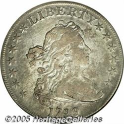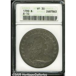 <B>1799<img border='0' src='http://www.heritagecoins.com/images/star.gif' width=10 height=10>$1 VF30 ANACS.</B></I> B-10, BB-163, R.1. Die State III. Spindly die cracks through OF and the STA in STATES confirm the attribution. Sky-gray and lavender colors alternate across this Draped Bust Dollar. The reverse is bold for the assigned grade. A subdued pinscratch connects the hair ribbon to the seventh star.<BR><I>From The Luke Fay Collection.</B></I>