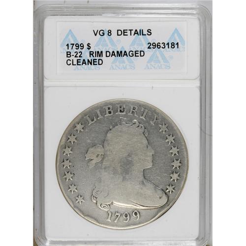 <B>1799 $1 --Cleaned, Rim Damaged--ANACS. VG8 Details.</B></I> B-22. NGC Census: (54/2217). PCGS Population (29/2037). Mintage: 423,515. Numismedia Wsl. Price: $720. (#6878)<BR><BR><b>Shipping:</b> Coins & Currency (<a target="_blank" href="http://www.heritageauctions.com/common/shipping.php">view shipping information</a>)