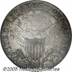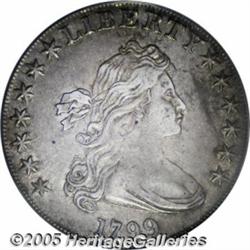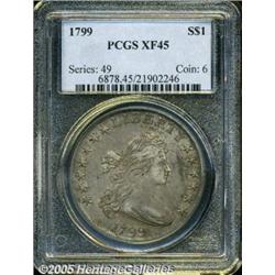 <B>1799<img border='0' src='http://www.heritagecoins.com/images/star.gif' width=10 height=10>$1 XF45 PCGS.</B></I> B-8, BB-165, R.2. An interesting variety that shows a trace of the N in UNITED having been initially punched in upside-down, a trace of which remains on the lower right as a line between the bottom of the N and I. This is a later die state with weakness evident on the reverse stars. This particular coin, while it may not appeal to everyone, is undoubtedly original. The surfaces show medium gray patina overall with the occasional dash of near-brilliance, as seen over the highpoints of the design, that alternate with irregular splotches of deep gray, as seen in front of Liberty's face. Good details for the grade with no large or mentionable abrasions on either side.