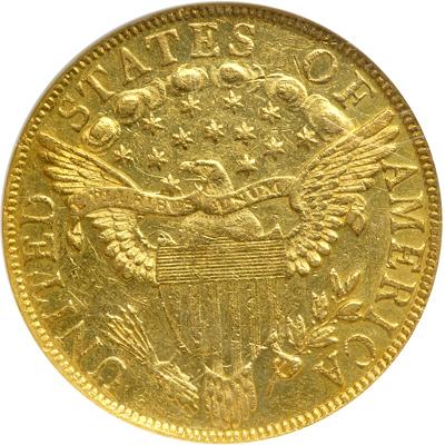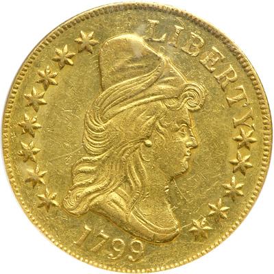1799 $10 Capped Bust. Small obverse stars. NGC graded AU-58. Warm golden surfaces exhibit sufficient luster and a satin, almost matte-like quality to place the grade squarely in the About Uncirculated 58 camp. The strong details really engage the aesthetic sense with their intricacy. Normal abrasion in the field and on devices; rims are choice. Pop 6; 7 finer, 1 in 61, 3 in 62, 3 in 64 (PCGS # 98562) .
