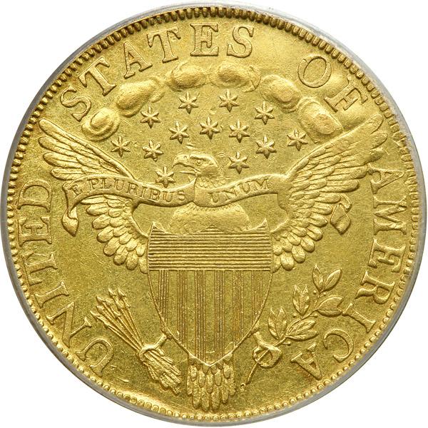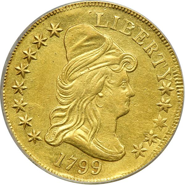 1799 $10 Capped Bust. Small obverse stars. . BD-7, Breen-6840, Rarity-3. PCGS Genuine. Our grade is Sharpness of AU, cleaned and expertly repaired. A very acceptable example of this early $10 Capped Bust design, despite hairlines and surface disturbance, the design is fairly well defined on the key features with greenish-yellow golden hues on both sides.