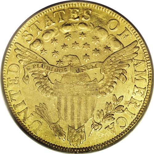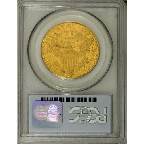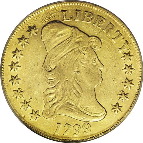 <B>1799 $10 Irregular Date, Small Stars Obverse AU53 PCGS.</B></I> Breen-6840, Taraszka-19, BD-7, R.3. The 7 in the date is high and leans right, while a mint-made die line is found below the right serif of the T in UNITED. This attractive specimen is from an early die state, lacking the vertical die crack through the E in LIBERTY. This coin is also without the crack through IBERTY and the right-side stars, documented for the late-state example in the <I>Harry W. Bass, Jr., Museum Sylloge.</B></I> This canary-gold example has abundant bright luster and a crisp strike. A few moderate abrasions along the upper left obverse border appear also to be of mint origin and do not reduce the eye appeal.<BR><BR><b>Shipping:</b> Coin/Currency (<a target="_blank" href="http://www.heritageauctions.com/common/shipping.php">view shipping information</a>)