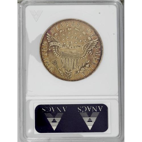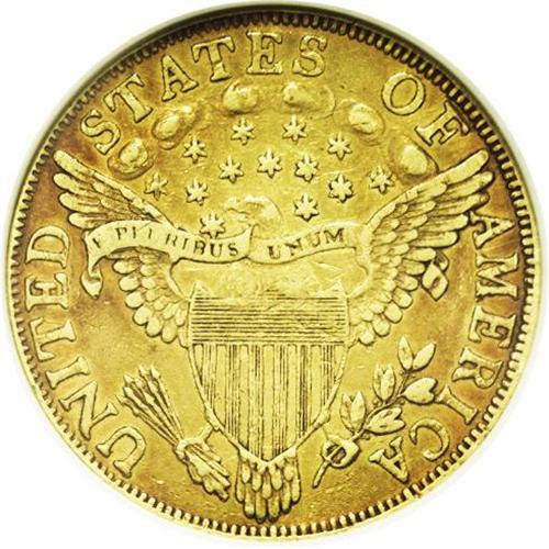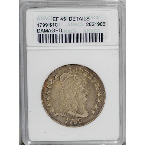 <B>1799<$10> Irregular Date, Small Stars Obverse--Damaged--ANACS. XF45 Details.</B></I> Breen-6840, BD-7, Taraszka-19, R.3. The most available of the early eagles to this point, and one of the most available varieties. The 17 in the date are tilted far to the right, and the 7 is higher than the 1. On the reverse star 12 is has a single point touching the scroll, and star 13 is distant from the ribbon. The "damage" that ANACS alludes to is many tiny obverse field abrasions combined with a somewhat unnatural surface appearance, including an olive-brown obverse and an orange-gold reverse with magenta in the protected areas.