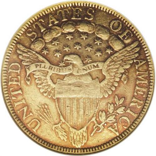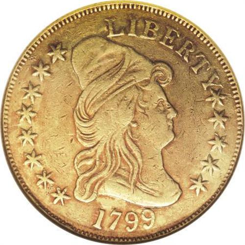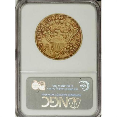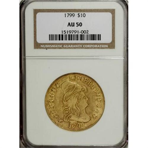 <B>1799 $10 Small Stars Obverse AU50 NGC.</B></I> BD-8, R.5. This rare variety is attributed by the evenly spaced 17 in the date, but tilted far right, especially the 7, which is also higher than the 1; the point of star 12 touching the upper beak and also the scroll with two points, and star 13 touching the scroll. John Dannreuther and Harry Bass, in their <I>Early U.S. Gold Varieties</B></I> book, estimate 44-55 known pieces.<BR> Peach-gold surfaces display splashes of purplish coloration, especially on the reverse, of this AU50 example. The design elements show fairly good definition, except for coalescence of some of the horizontal lines in the shield. Light to moderate marks, a bit more so on the obverse.<BR><BR><B>Coin Engraver:</B> Robert Scot<BR><BR><b>Shipping:</b> Coins & Currency (<a target="_blank" href="http://www.heritageauctions.com/common/shipping.php">view shipping information</a>)