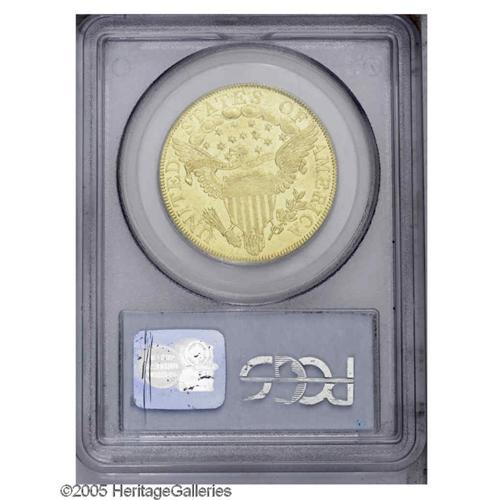 <B>1799<$10> Large Stars Obverse AU58 PCGS.</B></I> Breen-6841, B. 5-G, Taraszka-22, R.3. Very well defined with pleasing yellow-gold color and glimpses of luster about the devices. Although numerous abrasions are found over both sides, they are generally light and individually unobtrusive. A few out-of-the-way adjustment marks are noted along the upper-right reverse border. B. 5-G is the more available of only two die marriages of the Large Stars variety and can be recognized by the leaf tip pointing to the right base of I in AMERICA.