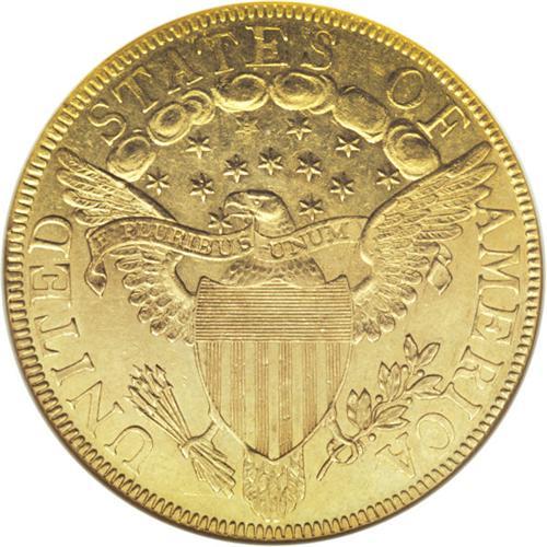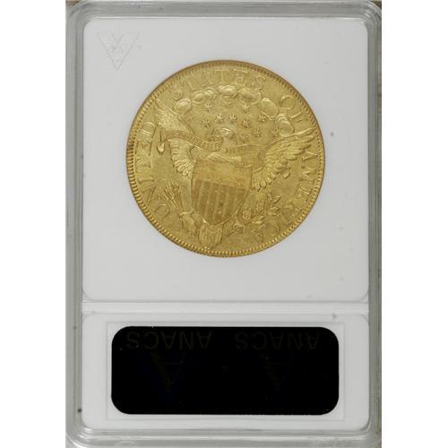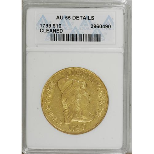 <B>1799 $10 Large Stars Obverse--Cleaned--ANACS. AU55 Details.</B></I> Breen-6841, Taraszka-22, BD-10, R.3. This is the 1799 variety that is seen more often than any other die marriage in the early eagle series from 1795 to 1804. It is an excellent choice for the date or type collector. Each side of this brilliant green-gold example has light hairlines indicative of cleaned surfaces, yet the overall eye appeal is still excellent with sharp design definition.<BR><BR><b>Shipping:</b> Coins & Currency (<a target="_blank" href="http://www.heritageauctions.com/common/shipping.php">view shipping information</a>)