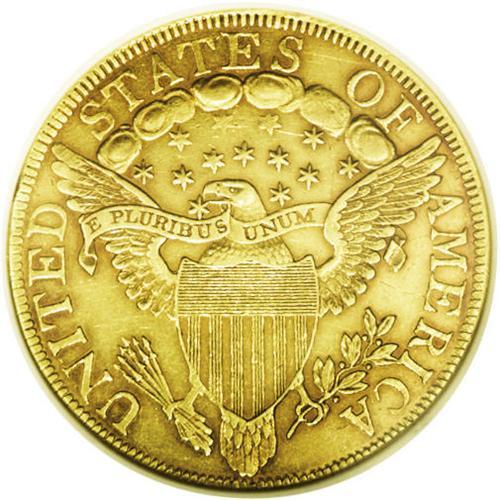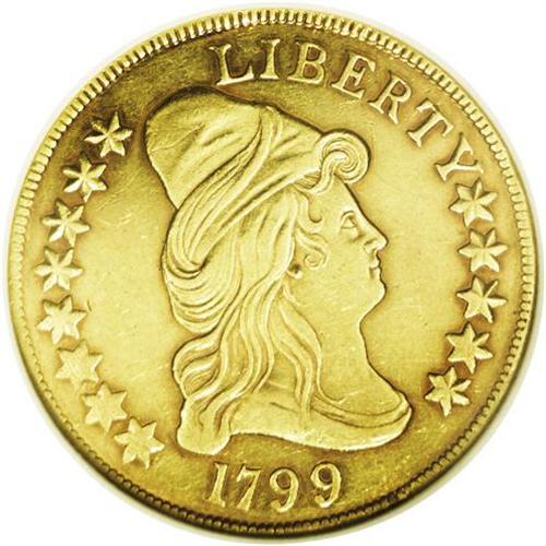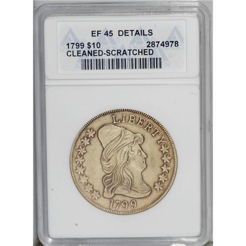 <B>1799<$10> Large Stars Obverse--Cleaned, Scratched--ANACS. XF45 Details.</B></I> Breen-6841, BD-10, Taraszka-22, R.3. A new large stars punch was used for the obverse of this variety. The date is spaced 1 7 9 9, and star 8 is rotated. On the reverse a leaf touches the I in AMERICA at the lower right. The fields are unnaturally bright on each side, indicative of cleaning, and the noted scratches occur on each side of the eagle, in the obverse field before Liberty's face, and on the cap. The cleaning is more distracting than the scratches, however, which are not too deep and distracting, and much pleasing detail remains.