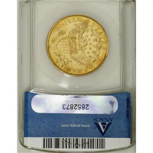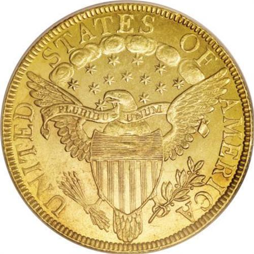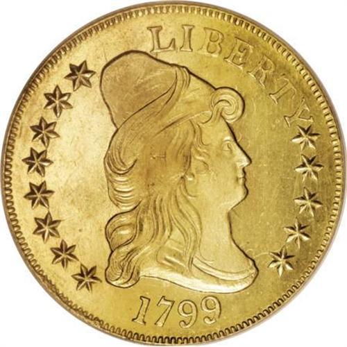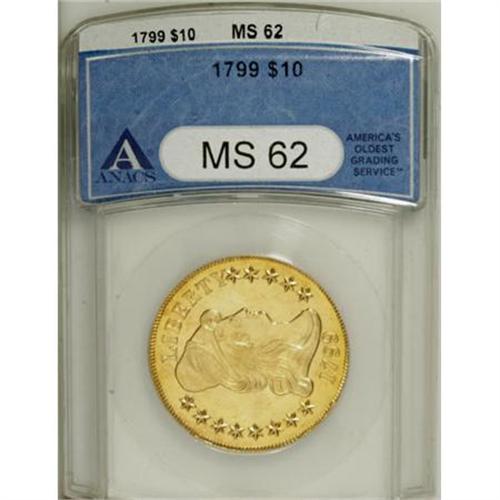 <B>1799 $10 Small Stars Obverse MS62 ANACS.</B></I> BD-8, R.5. This is the "irregular date" obverse with the digit 1 far below the curl and the last 9 nearly touching the bust, the opposite of normal date placement for this series. This obverse die was combined with two different reverse dies to strike varieties that are cataloged as BD-7 and BD-8 in the new reference by John Dannreuther. While the BD-7 die combination ranks as one of the most common 1799 eagle varieties, this BD-8 marriage is much rarer. Dannreuther estimated that only 45 to 55 pieces are known.<BR> This specimen has a rather extraordinary look. Both sides have exceptional yellow-gold brilliance with a slightly matte appearance. Faint clash marks can be seen on the obverse, along with traces of die polishing lines. The reverse is cracked through AMERICA.<BR><BR><B>Coin Engraver:</B> Robert Scot<BR><BR><b>Shipping:</b> Coins & Currency (<a target="_blank" href="http://www.heritageauctions.com/common/shipping.php">view shipping information</a>)