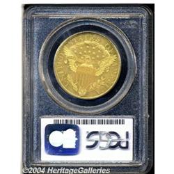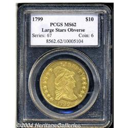 <B>1799<$10> Large Stars Obverse MS62 PCGS.</B></I> B. 5-G, Taraszka-22, R.3. The Philadelphia mint struck 37,449 Capped Bust Right, Heraldic Eagle Tens between May 14, 1799 and September 4, 1800. Breen (1988) believes that all of these coins were dated 1799, an opinion also advanced by, among other editions, the 2004 <I>Guide Book.</B></I> Although the 1799 rivals the 1801 for the distinction of the most readily obtainable date of the type, only approximately 2% of the original mintage is believed extant in all grades. The B. 4-E and B. 5-G die marriages seem to be the most common in today's market, and they include a not insignificant number of Mint State coins.<BR> Virtually all of the central design elements on both sides of the present example are crisply detailed. Even the peripheries are uncommonly well impressed for the type. Some die polish lines (as produced) show up particularly in the reverse field. Both sides are awash in green-gold color that lightens to reddish-gold shades as the surfaces dip into the light. Semi-reflective in texture with a number of tiny field marks confined mostly to the obverse side. <BR><BR><B>Important notice:</B> Heritage usually auctions material at the rate of 200-250 lots per hour. On some occasions eBay Live bid software or the Internet may not be able to keep up with the pace of the auction. We recommend placing a realistic absentee bid now as insurance to avoid disappointment. Occasionally the auctioneer may eliminate or reject an eBay Live bid, and the auctioneer may also reopen a lot after the close of the eBay live bidding (usually because we missed an audience bid), and may reject your bid even if it shows you as the winning bidder. By bidding via eBay Live, you agree that Heritage may award the lot to another bidder at its sole discretion under the circumstances described above or any other reasonable circumstances. Since eBay bids are not shown to us until we open the lot on the floor, we treat those bids just like floor bids. In most cases the floor responds before the eBay bid is presented to us, due to Internet lag time, so for consistency we have made it a policy that floor bids are always considered first over tie eBay live bids. Also please note that all Heritage lots purchased through eBay Live carry a 20% Buyer's Premium. Please make sure you read the Terms and Conditions before you bid.