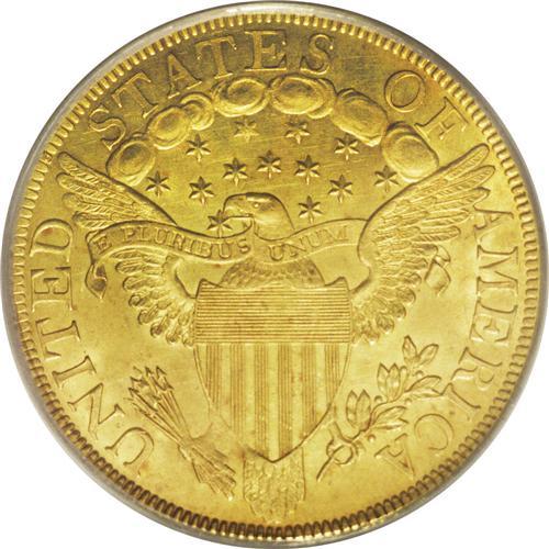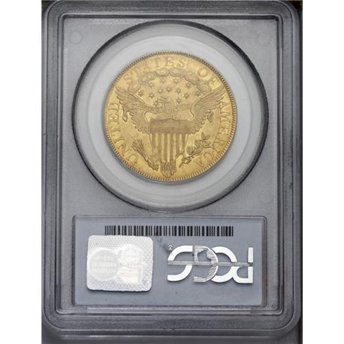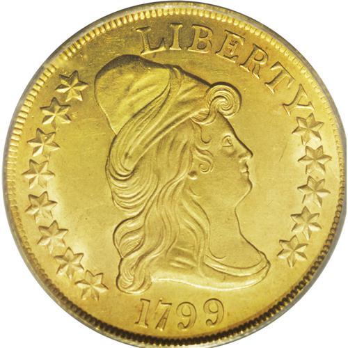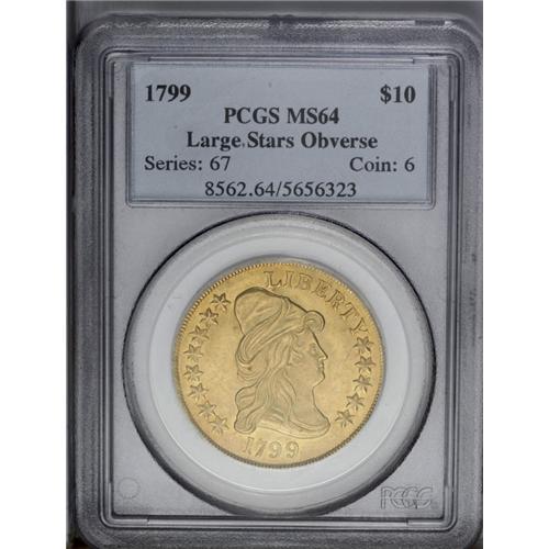 <B>1799 $10 Large Stars Obverse MS64 PCGS.</B></I> Breen-6841, BD-10, Taraszka-22, R.3. Only one 1799 die (Breen's obverse 5) has Large Obverse Stars. This obverse was paired with two different reverses, BD-9 and BD-10. These are promptly distinguished by the location of a leaf tip, which points between IC for the very rare BD-9, and points to the I on the collectible BD-10. The <I>Guide Book</B></I> distinguishes between the Large and Small Obverse Stars varieties, but prices them equally in all grades, since the Small Obverse Stars BD-7 is comparable in rarity with BD-10. Breen, in his 1988 <I>Encyclopedia,</B></I> breaks the Small Obverse Stars into further subtypes: the Wide Date (BD-1 to BD-3), the Close Date (BD-4 to BD-6), and the Irregular Date (BD-7 and BD-8). It is possible that the <I>Guide Book</B></I> will someday recognize these different Small Date subtypes, and those collecting by <I>Guide Book</B></I> variety would then diminish the supply of 1799 eagles available for date collectors.<BR> This is a splendid example of the Large Obverse Stars subtype. The strike is enticingly close to full. The eagle's left (facing) leg shows slight softness, but the eagle's breast and neck feathers are intricate, and Liberty's hair also has complete definition. Some of the obverse denticles, near 3 and 9 o'clock, are lower in relief and display roller marks. However, the fields and the major devices show no evidence of either adjustment marks or roller marks. Further, no abrasions are visible to the unaided eye. Once studied at length beneath a glass, a few wispy field marks become apparent, but although these determine the grade, they do not limit the eye appeal. The khaki-gold toning is even, and billowy luster dominates the legends and devices.<BR><I>From The Essex Palm Collection.</B></I><BR><BR><b>Shipping:</b> Coin/Currency (<a target="_blank" href="http://www.heritageauctions.com/common/shipping.php">view shipping information</a>)
