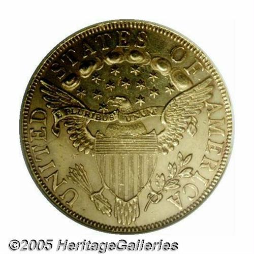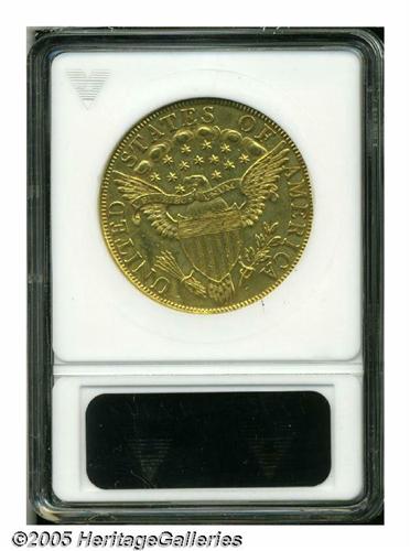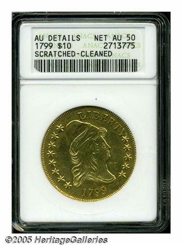 <B>1799<$10> Large Stars Obverse--Scratched, Cleaned--ANACS. AU Details, Net AU50.</B></I> Breen-6841, B. 5-G, Taraszka-22, R.3. Both sides display an unnaturally bright, chrome-like appearance that we would attribute to polishing. A cluster of light scratches are noted in the lower right obverse field. Despite its obvious flaws, still a great piece of 18th century American numismatic history.