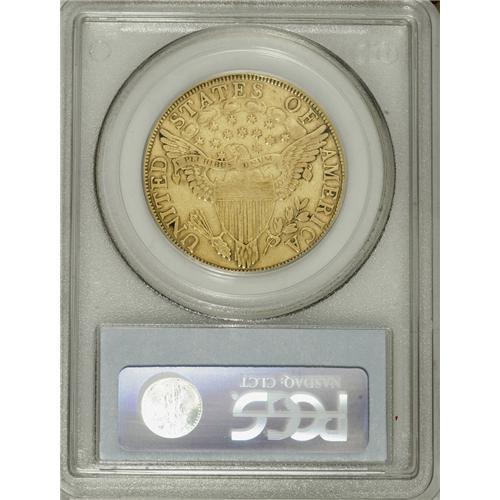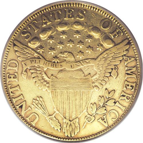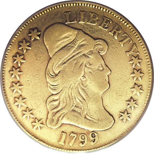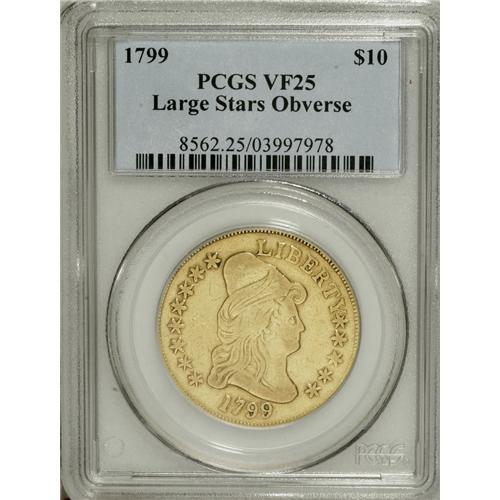 <B>1799 $10 Large Stars Obverse VF25 PCGS.</B></I> Breen-6841, Taraszka-22, BD-10, R.3. One of only two Large Stars varieties of the 1799 gold eagle, and easily the more common of the two. A leaf tip on the reverse is connected to the lower right foot of I in AMERICA, identifying this piece as an example of B-10 rather than B-9 (the other Large Stars die pair). Typically worn for the grade, this green-gold coin shows a number of small blemishes on each side, but you will need a magnifier in order to see most of them. Minimal verdigris nestles near a few of the peripheral devices. For VF type purposes on an early eagle, this piece would be an ideal candidate, especially if the 1799 date is desired.<BR><BR><b>Shipping:</b> Coins & Currency (<a target="_blank" href="http://www.heritageauctions.com/common/shipping.php">view shipping information</a>)