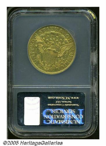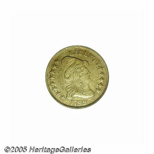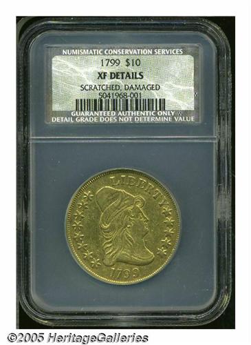 <B>1799<$10> Large Stars Obverse XF Details, Scratched, Damaged, NCS.</B></I> Breen-6841, B. 5-G, Taraszka-22, R.3. Arguably the 1799 Ten is the most frequently seen of all early gold Ten Dollar coins. As such, it enjoys a constant demand from collectors as a type coin, and this piece, even though scratched in the obverse field and moderately abraded overall, presents the type collector with a rare opportunity to purchase a more affordable example. Well defined.