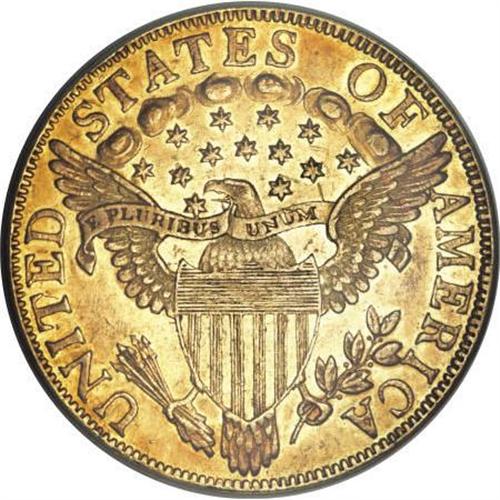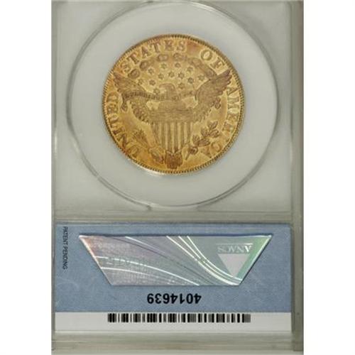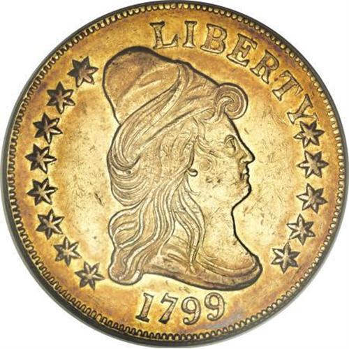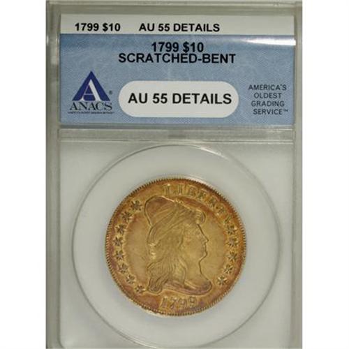 <B>1799 $10 Small Stars Obverse--Scratched, Bent--ANACS. AU55 Details.</B></I> Irregular Date, Breen-6840, Taraszka-19, BD-7, R.3. Bass-Dannreuther Die State a/b, the early die state without cracks or obverse clashmarks, which the reference notes "may exist." Bass owned five examples of BD-7, <I>none</B></I> of which were this early die state. Yellow-gold and fire-red with no obvious signs of a bend. A scratch is concealed across the final two clouds into the right (facing) wing, and the latter also has a pinscratch. Moderate marks on the cheekbone and right obverse field are barely worthy of mention.<BR><BR><B>Coin Engraver:</B> Robert Scot<BR><BR><b>Shipping:</b> Coins & Currency (<a target="_blank" href="http://www.heritageauctions.com/common/shipping.php">view shipping information</a>)