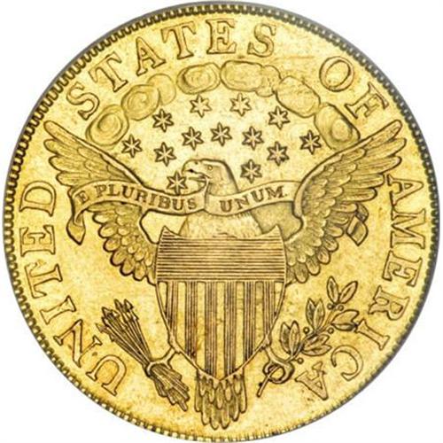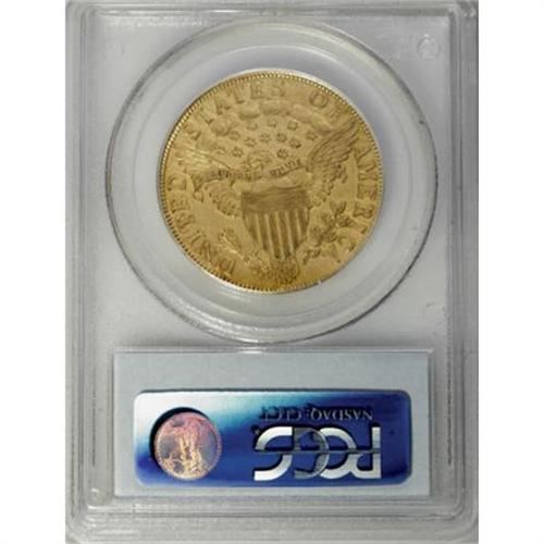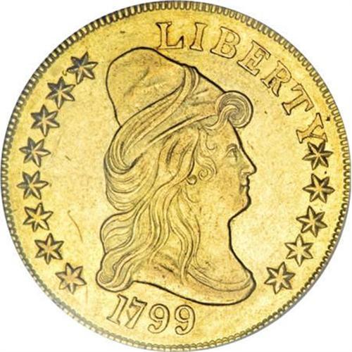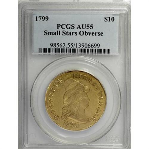 <B>1799 $10 Small Stars Obverse AU55 PCGS.</B></I> Breen-6838, Taraszka-16, BD-4, R.7. Since Bass had a lone example of BD-4 to examine in the course of his research, he could only confirm one die state, although he contemplated the existence of an earlier state, as well as a terminal state, existed. The current coin is identical in terms of die state to the BD-4 specimen in Bass' core collection, and it is also identical to the other example in the current sale.<BR> This variety comprises Bass-Dannreuther obverse die 4 and reverse die A. It is believed that reverse A became terminal during this short die marriage (its final of four uses). Obverse 4 was later paired with two other reverse dies to create BD-5 and BD-6, both of which are rare, but not to the extent of BD-4.<BR> A hint of green color accents the light yellow-gold surfaces of this Choice AU piece. The surfaces are lightly abraded, consistent with the grades. A tiny mark above the left top of Y will identify this piece. A minuscule rim nick over the R in LIBERTY is hidden by the PCGS holder. There is no evidence of adjustment marks on either side.<BR><BR><B>Coin Engraver:</B> Robert Scot<BR><BR><b>Shipping:</b> Coins & Currency (<a target="_blank" href="http://www.heritageauctions.com/common/shipping.php">view shipping information</a>)