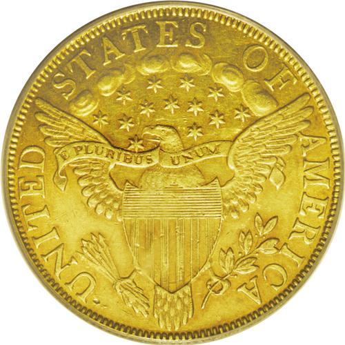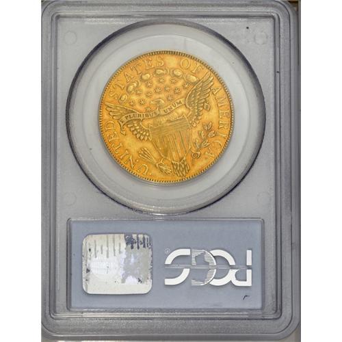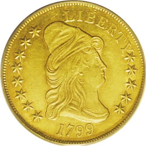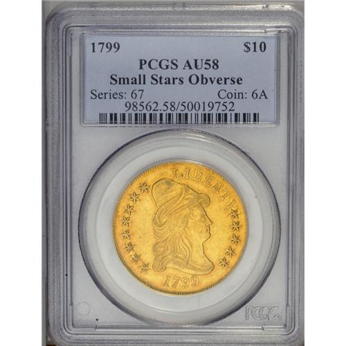 <B>1799<$10> Small Stars Obverse AU58 PCGS.</B></I> Irregular Date, Breen-6840, B. 4-E, Taraszka-19, R.3. The 7 in the date is high and leans right, while a mint-made die line is found below the right pendant of the T in UNITED. An early die state that is without the vertical die crack through the E in LIBERTY. This reddish-gold example has traces of remaining luster and a crisp strike. A typical amount of small marks in the fields do not detract from the eye appeal. Bidders will want to pay close attention to this ideal representative of the Capped Bust ten dollar coin.
