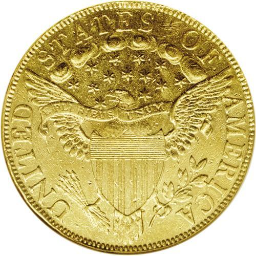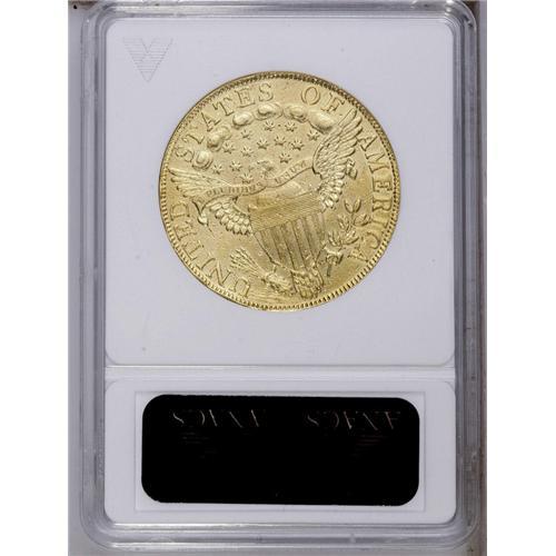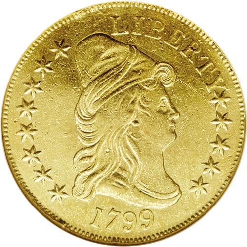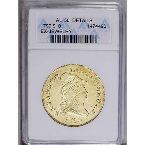 <B>1799<$10> Small Stars Obverse--Ex-Jewelry--ANACS. AU50 Details.</B></I> Irregular Date, Small Stars, Breen-6840, B. 4-E, Taraszka-19, R.3. Although little circulation wear is evident, the surfaces are unnaturally bright and are inundated with tiny marks on each side. Minor rim damage and a couple areas of wispy pinscratches are apparent, and the upper right obverse quadrant has a pair of bright pinscratches. Still a bold example of this coveted early large gold type, and a piece that shared the adventures of a past owner for presumably many years.
