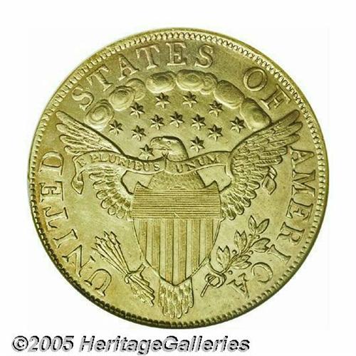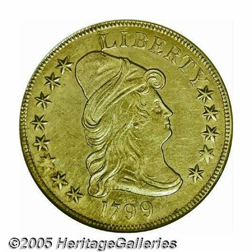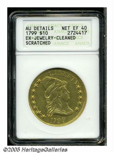 <B>1799<$10> Small Stars Obverse--Ex-Jewelry, Cleaned, Scratched--ANACS. AU Details, Net XF40.</B></I> Breen-6839, B. 2-A, Taraszka-14, R.6. Although the 1799 is an available date within this rare gold type, most survivors encountered are Taraszka-19 or Taraszka-22. Taraszka-14, which has stars distant from the bust and the Y in LIBERTY, is decidedly rare. A bold piece with ample remaining luster, but cloudy from cleaning and a few faint pinscratches are concealed on the portrait and obverse field. The reverse is refreshingly unabraded. A mint-made strike-thru affects the third obverse star.<BR><I>From the Dr. Kurt Peters Collection.</B></I> From the Dr. Kurt Peters Collection.