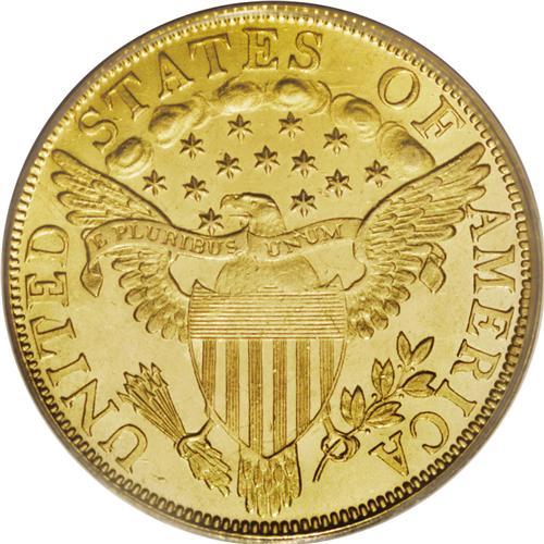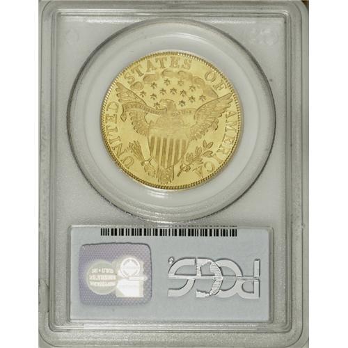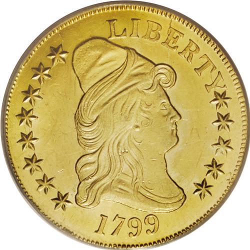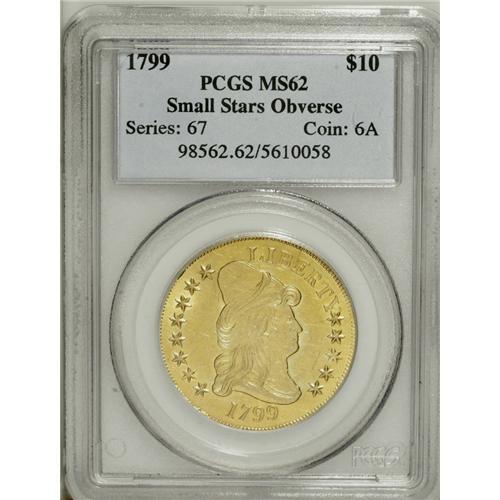 <B>1799 $10 Small Stars Obverse MS62 PCGS.</B></I> Irregular Date, Breen-6840, BD-7, Taraszka-19, R.3. One of the two "Irregular Date" varieties of this year, being distinguished on most examples by rim crumbling over star 7 and a vertical die crack through the E in LIBERTY to her forecurl. Here a on this intermediate to late die state another peripheral crack on the obverse advances from the T through stars 9-11, and culminates on the border adjacent to star 12. The strike on this attractive yellow-gold example is well executed in virtually all areas and a semi-prooflike sheen emanates from both sides.<BR><BR><b>Shipping:</b> Coin/Currency (<a target="_blank" href="http://www.heritageauctions.com/common/shipping.php">view shipping information</a>)