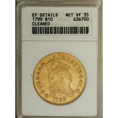 <B>1799 $10 Small Stars Obverse--Cleaned--ANACS. XF Details. Net VF35.</B></I> Breen-6838, Taraszka-18, BD-6, R.5. A bold example of this difficult die marriage. 1799 is an available date, but most examples are either BD-7 or BD-10. Vertical hairlines cross both sides, and the surfaces are somewhat bright. A potential opportunity to acquire a rare variety at a type price.<BR><I>From The Casa Becca del Norté Collection.</B></I><BR><BR><B>Coin Engraver:</B> Robert Scot<BR><BR><b>Shipping:</b> Coins & Currency (<a target="_blank" href="http://www.heritageauctions.com/common/shipping.php">view shipping information</a>)