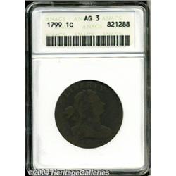<B>1799<1C> AG3 ANACS.</B></I> S-189, High R.2. A lovely example for the grade, and perhaps conservatively rated by ANACS. This is the key-date issue among Draped Bust large cents, and is always in demand by date and variety collectors. The present example has pleasing dark brown fields with lighter tan devices. On the obverse, all of LIBERTY is visible in addition to much of the date. Liberty shows some of her hair details. All of the lettering on the reverse is visible although some is admittedly weak. Overall, this is a completely acceptable example of the date. <BR><BR><B>Important notice:</B> Heritage usually auctions material at the rate of 200-250 lots per hour. On some occasions eBay Live bid software or the Internet may not be able to keep up with the pace of the auction. We recommend placing a realistic absentee bid now as insurance to avoid disappointment. Occasionally the auctioneer may eliminate or reject an eBay Live bid, and the auctioneer may also reopen a lot after the close of the eBay live bidding (usually because we missed an audience bid), and may reject your bid even if it shows you as the winning bidder. By bidding via eBay Live, you agree that Heritage may award the lot to another bidder at its sole discretion under the circumstances described above or any other reasonable circumstances. Since eBay bids are not shown to us until we open the lot on the floor, we treat those bids just like floor bids. In most cases the floor responds before the eBay bid is presented to us, due to Internet lag time, so for consistency we have made it a policy that floor bids are always considered first over tie eBay live bids. Also please note that all Heritage lots purchased through eBay Live carry a 20% Buyer's Premium. Please make sure you read the Terms and Conditions before you bid. </span></font></tr></table></td></tr></table>