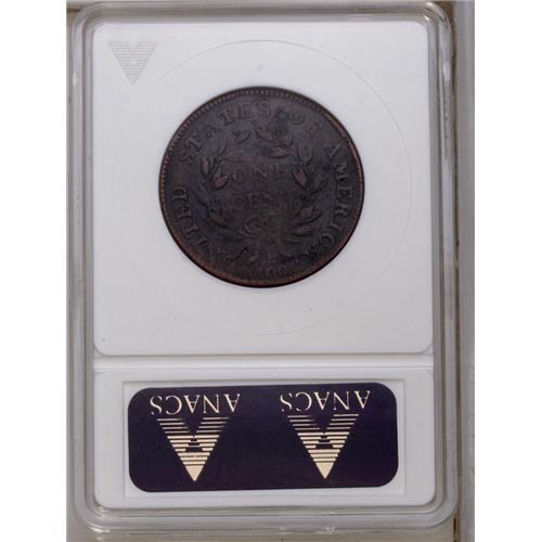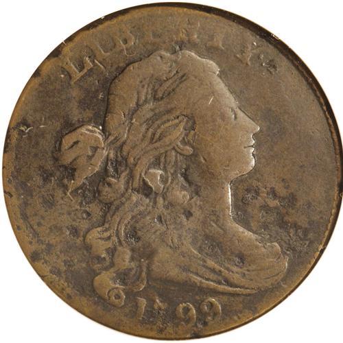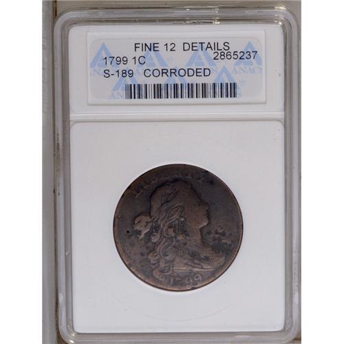 <B>1799<1C>--Corroded--ANACS. Fine 12 Details.</B></I> S-189, High R.2. A suitable representative of this low mintage Large cent rarity, the obverse shows a dark, heavily pitted surface. The reverse is much smoother with a small area of encrustation between STATES and OF, and above average definition overall. All for digits of the date are unusually clear. An affordable example for the budget-minded collector. EAC 4.