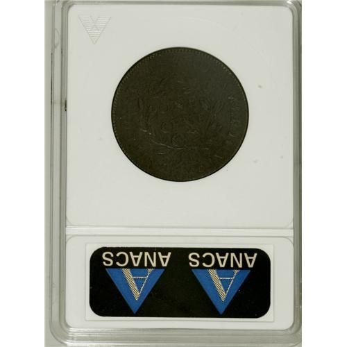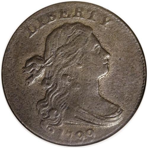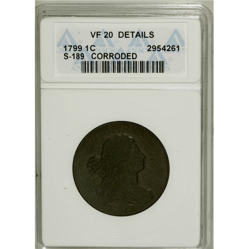 <B>1799 1C --Corroded--ANACS. VF20 Details.</B></I> S-189, B-3, R.2. The 99 of the date are closer than those of Obverse 1 (S-188), the point of 1 in the date is closer to the hair than to the curl, and the die chip between the E in ONE and T in CENT barely shows only when the coin is tilted is such a way as to catch the light. Medium brown surfaces reveal light to moderate, uniform porosity. The design elements on both obverse and reverse are quite well defined, especially the strands in Liberty's hair, the date, LIBERTY, most of the wreath, and the ONE CENT denomination. All in all, a decent representative of this key-date issue. EAC 8.<BR><BR><b>Shipping:</b> Coins & Currency (<a target="_blank" href="http://www.heritageauctions.com/common/shipping.php">view shipping information</a>)