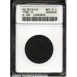 <B>1799<1C>--Corroded--ANACS. VG Details, Net Good 4.</B></I> S-189, R.3. Both LIBERTY and the date are quite boldly defined, while some weakness is noted on the reverse. The corrosion mentioned by ANACS is quite "old" and blends so nicely with the balance of the coin that we do not find this imperfection objectionable. <BR><BR><B>Important notice:</B> Heritage usually auctions material at the rate of 200-250 lots per hour. On some occasions eBay Live bid software or the Internet may not be able to keep up with the pace of the auction. We recommend placing a realistic absentee bid now as insurance to avoid disappointment. Occasionally the auctioneer may eliminate or reject an eBay Live bid, and the auctioneer may also reopen a lot after the close of the eBay live bidding (usually because we missed an audience bid), and may reject your bid even if it shows you as the winning bidder. By bidding via eBay Live, you agree that Heritage may award the lot to another bidder at its sole discretion under the circumstances described above or any other reasonable circumstances. Since eBay bids are not shown to us until we open the lot on the floor, we treat those bids just like floor bids. In most cases the floor responds before the eBay bid is presented to us, due to Internet lag time, so for consistency we have made it a policy that floor bids are always considered first over tie eBay live bids. Also please note that all Heritage lots purchased through eBay Live carry a 20% Buyer's Premium. Please make sure you read the Terms and Conditions before you bid. </span></font></tr></table></td></tr></table>