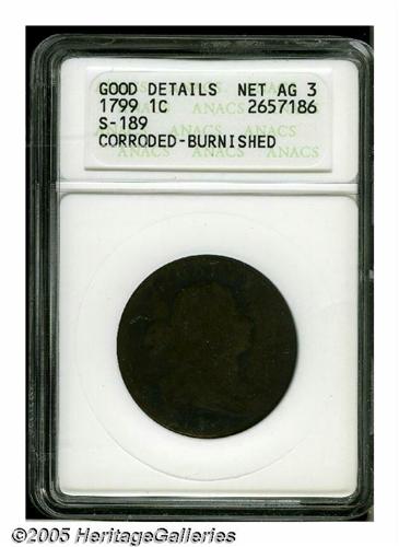<B>1799<1C>--Corroded, Burnished--ANACS. Good Details, Net AG3.</B></I> S-189, High R.2. A well-worn example of this key date large cent. The present example has a deep dark-chocolate patina and moderately corroded surfaces, especially on the reverse. Liberty is outlined and raised, but shows little detail. The date and LIBERTY are weak.