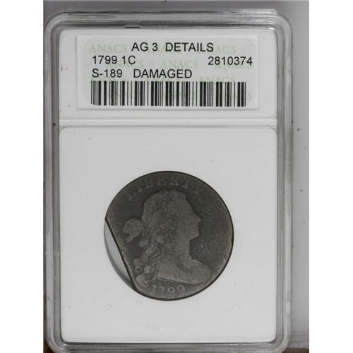 <B>1799 1C --Damaged--ANACS. AG3 Details.</B></I> S-189, High R.2. The date is clear as is most of Liberty's profile, but this dark brown, key date cent has a rather noticeable problem. An area of metal is missing from 7 o'clock to 10 o'clock, appearing to have been clipped away with shears. The reverse is worn nearly smooth, and minor porosity shows overall. Still, a very affordable example of this key date large cent. EAC 1.