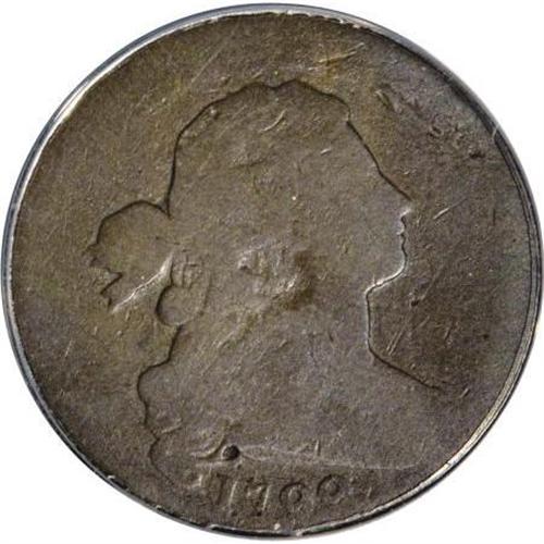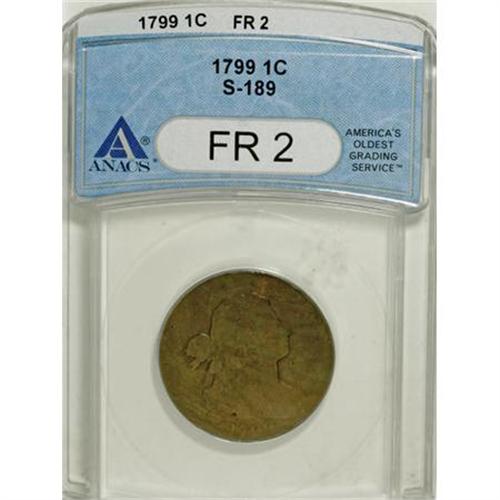 <B>1799 1C Fair 2 ANACS.</B></I> S-189, B-3, R.2. Just about all of the 1799 shows clearly, and most of the Liberty motif is raised above the field, and displays a slight bit of internal detail. LIBERTY is worn away, as are most of the reverse design elements. Attractive medium brown color graces both sides, and there are no significant abrasions to report. Generally speaking, this key date example illustrates just honest wear. EAC 2.<BR><BR><B>Coin Engraver:</B> Robert Scot<BR><BR><b>Shipping:</b> Coins & Currency (<a target="_blank" href="http://www.heritageauctions.com/common/shipping.php">view shipping information</a>)