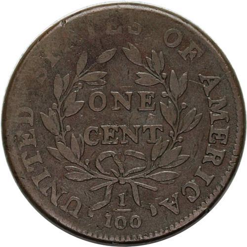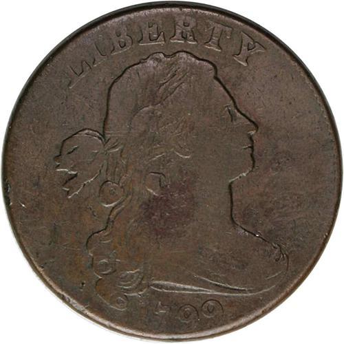 <B>1799<1C> S-189, B-3, High R.2. Fine 12 NGC. VG10 EAC.</B></I> The die chip in the field between the E of ONE and the T of CENT is strong and somewhat triangular, and a rim break is developing above the AM of AMERICA. Medium brown toning covers both sides of this representative of what is the rarest date in the Large Cent series. The design elements are generally well centered on the planchet and exhibit nice definition. Most of Liberty's features are clear, and the date and LIBERTY are relatively strong. Except for weakness in the TATES of STATES, all of the reverse devices exhibit a high degree of crispness for the grade. A few minute contact marks are scattered over each side, particularly on the obverse, but none can be considered offensive.<BR><I>Ex: Charles French (1961 MANA); George Ramont; Del Bland (5/19/1972).</B></I> Envelope Included.