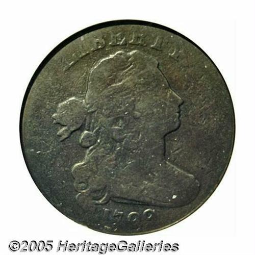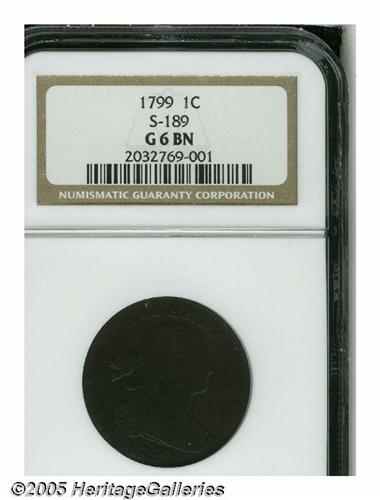 <B>1799<1C> Good 6 NGC.</B></I> S-189, High R.2. All legends are legible on this collectible deep mahogany brown key date Cent. The bottom of the date and the tops of LIBERTY are partly faded into the rim, the fraction and denomination are bold, as is the case for most of UNITED STATES OF AMERICA. The obverse has distributed tiny marks, but none of these distract, and are expected for the grade.