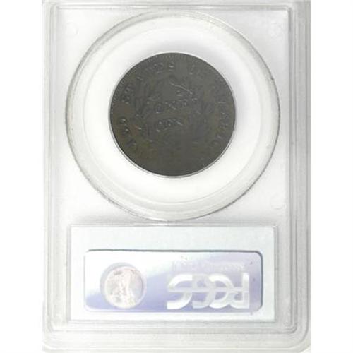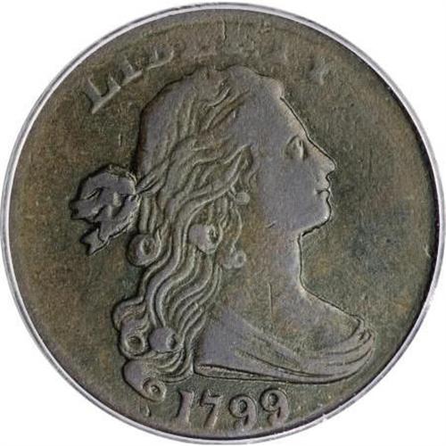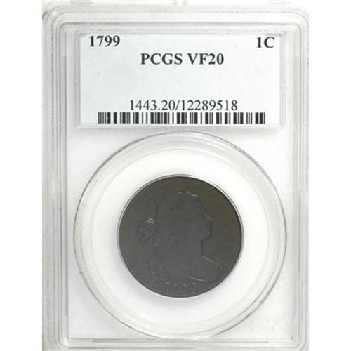 <B>1799 1C VF20 PCGS.</B></I> S-189, High R.2. Die State IV. This later die state shows the date strong and LIBERTY weak. This difference in definition was caused by axial misalignment, but most examples show a weak date and strong LIBERTY. On the reverse, the die chip or "mintmark," as it was called for generations, is prominent in the field between (N)E and (N)T. <BR> The 1799 is one of the rarest and most famous of all dates in the large cent series. Only three die pairings are known, one of which is an NC (Non-Collectible). This is a darker example with light porosity, likely struck from Boulton planchet stock. The misalignment extends to other areas than those mentioned, with softness noted also on the top of Liberty's hair and denomination. Conversely, the lower portions of the obverse and the upper parts of the reverse are remarkably strong for the grade. A shallow scratch is located on each side, which helps identify this particular coin: on the obverse extending inward from the rim at 4 o'clock, and on the lower reverse across the left stem and ribbon. EAC 12.<BR><BR><b>Shipping:</b> Coins & Currency (<a target="_blank" href="http://www.heritageauctions.com/common/shipping.php">view shipping information</a>)