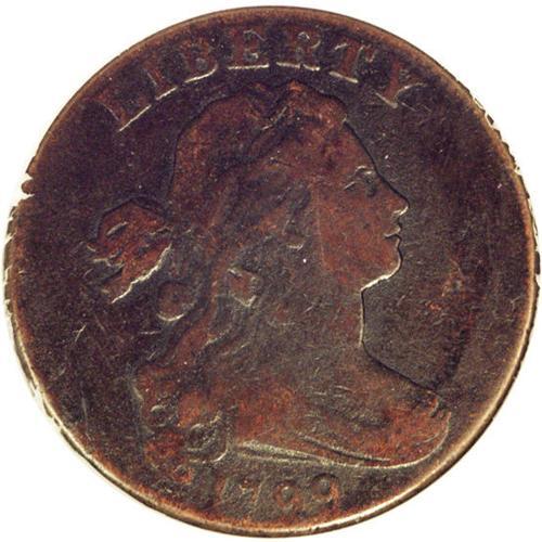 <B>1799 1C VG8 ANACS.</B></I> S-189, High R.2. Dark olive dominates the surfaces with areas of lighter copper on the highpoints that received the wear from circulation. Generally clean surfaces despite the wear, the most significant feature is the surface roughness. A loupe discovers a faint scratch through the top of Liberty's head ending behind her eye, and a nick on the center of the reverse connects the two Ns of ONE CENT. Always in great demand for the date, and the present coin would make a welcome addition to any collection lacking this issue. EAC 4.