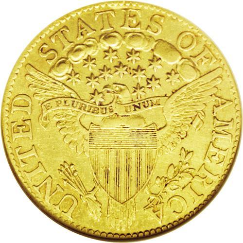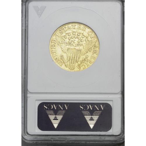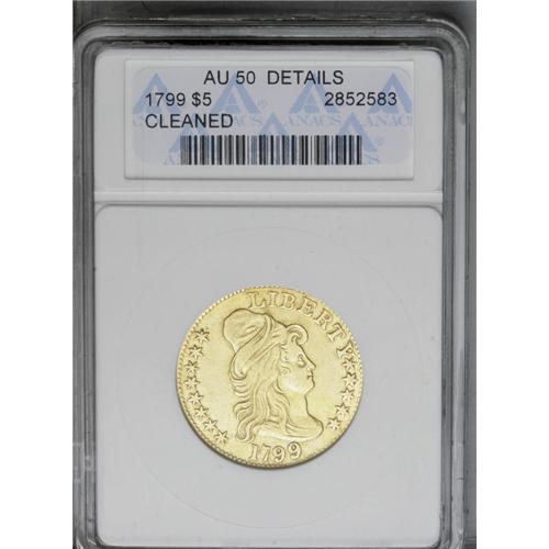 <B>1799<$5> Large Stars Reverse--Cleaned--ANACS. AU50 Details.</B></I> Breen-6436, B. 3-F, Miller-37, R.6. For the 1799, the survivors of the reported mintage of 7,451 pieces is splintered into nine different known die pairings. As a subtype, the Large Stars Reverse is even more rare than its Small Stars Reverse counterpart. Our records indicate only three prior appearances of Breen 3-F in Heritage Signature auctions. This example shows areas of faint hairlines, and traces of powder-blue residue accompany reverse recesses. Nonetheless, a bold piece with few relevant marks.