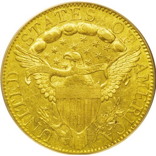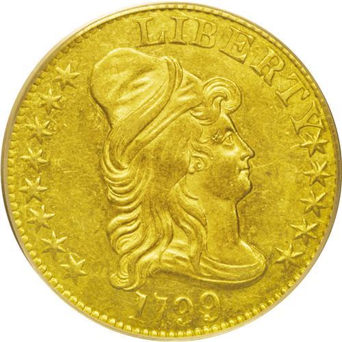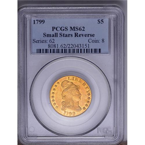 <B>1799<$5> Small Stars Reverse MS62 PCGS.</B></I> B. 1-A, Breen-6433, Miller-32, Bass-3060, R.5. This is an exceptional and exciting die state with mismatched clash marks featuring reverse clash marks showing the entire date--1798. Coins with clash marks are common, especially among early Mint issues. Those with clash marks from two different die marriages are highly unusual. Examples with clash marks from two different dates of coinage are extremely rare.<BR> The reverse die was first used with a 1798 obverse to coin the B. 6-H die variety. When that die combination was in the press, a die clashing accident happened, and much of the design was struck into the reverse die, including the entire 1798 date. After the obverse die was replaced with a new 1799-dated obverse, this coin was struck with the previous 1798-dated clash marks still clearly present. The entire 1798 date is visible behind STATES, with the 9 and 8 visible at TE. (Hint: remember that the date is a mirror image and is upside down when the reverse is examined.) The reverse die also has a prominent die crack from the border right of the final S, to a cloud, stars 4 and 8, and down to the eagle's head. Either this, or another crack, joins the eagle's wing and right side of T in UNITED. A similar example with mismatched clash marks appeared in the October 1999 sale of the Harry Bass Collection, lot 730.<BR> Compared to half eagles of the previous year, those dated 1799 are highly elusive. Nine different die marriages are known for the year, and the total combined population of all varieties indicates that only about 300 to 400 examples have survived to the present day. The B. 1-A die marriage is the second most common for the date, and yet, only about 50 or 60 examples are known.<BR> Certain characteristics provide easy attribution of this die variety. On the obverse, star 9 is recut, with its top point jo