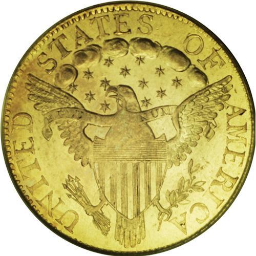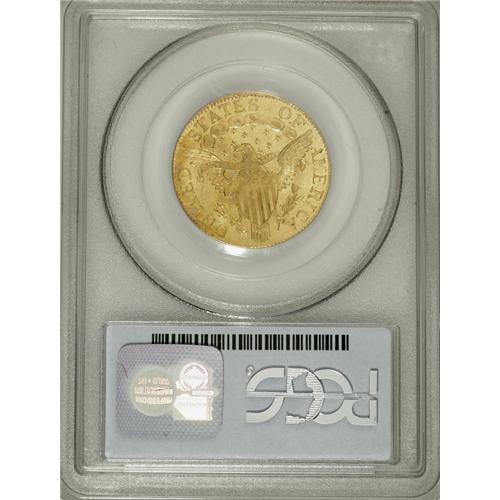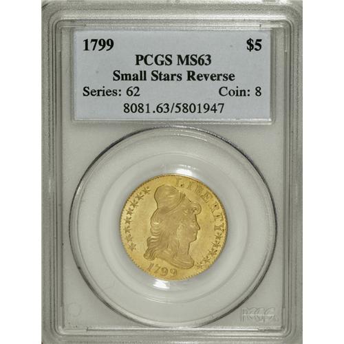 <B>1799 $5 Small Stars Reverse MS63 PCGS.</B></I> Breen-6434, BD-2, High R.5. This is an important date among early half eagles, and it is considerably underrated. Mint State examples, regardless of variety, are quite rare. This die combination is tied for the second most common of nine varieties known for the date, yet there are only about 35 to 40 examples known. This piece is tied for the finest example of the Small Stars type certified by PCGS, one of eight similar quality examples (3/07), assuming no resubmissions. While the central obverse and reverse are weakly defined as is often the case, the peripheral obverse and reverse details are bold. The obverse has highly lustrous and frosty yellow-gold surfaces while the reverse is light yellow with hints of orange toning, and partially prooflike with reflective fields. It appears the this example represents the terminal die state. The obverse is similar to that described as state b by J.D. Dannreuther, although with a few additional cracks and other die defects. The reverse is shattered with extensive die cracks.<BR> We noted that this is one of the two most common varieties of the date, yet still with a limited population. The total population of all nine die varieties is under 250 coins, according to Dannreuther. Famous gold collector Harry W. Bass, Jr. owned 18 of those coins, but only one specimen in his collection represented this die combination. Population: 8 in 63, 0 finer (3/07).<BR><I>From The Temecula Collection, Part Two.</B></I><BR><BR><b>Shipping:</b> Coins & Currency (<a target="_blank" href="http://www.heritageauctions.com/common/shipping.php">view shipping information</a>)