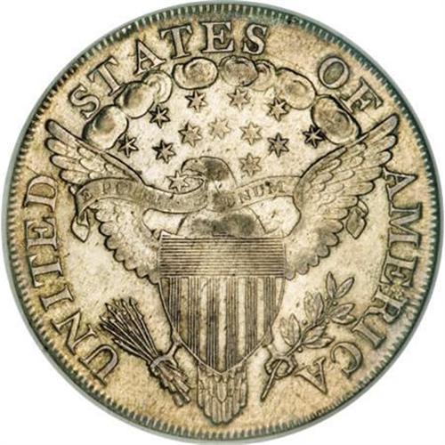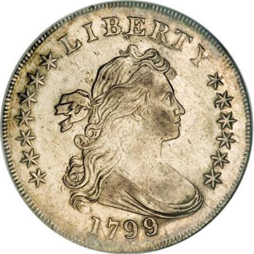 <B>1799/8 $1 13 Stars Reverse AU58 NGC.</B></I> B-2, BB-143, R.4. Die State II. This variety shares an obverse die with the two other 1799/8 overdates, but the three versions show subtle differences in the state of the obverse. As noted in the Bowers-Borckardt silver dollar <I>Encyclopedia</B></I> of 1993: "Die flaws as on BB-141, plus some new die flaws in and around the date and between star seven and the L in LIBERTY extending to the hair above the ribbon." The reverse shows 13 stars above the eagle, and a thick die crack down through <I>curved part of D</B></I> and showing at base. This is a gorgeous near-Mint example that displays considerable luster and lovely original toning that incorporates reddish-gold and gray hues that are pleasingly intermingled together. The coin is well struck with only minor wear and scattered, faint marks and pinscratches. This variety is rare in AU condition or finer.<BR><I>From The Queller Family Collection of Silver Dollars.</B></I><BR><BR><b>Shipping:</b> Coins & Currency (<a target="_blank" href="http://www.heritageauctions.com/common/shipping.php">view shipping information</a>)