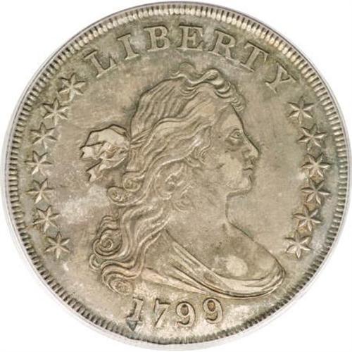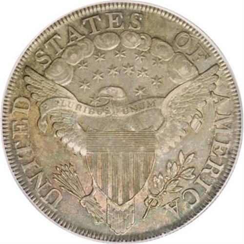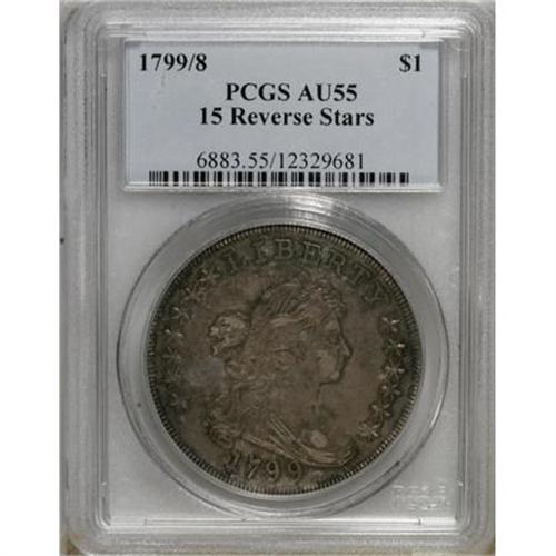 <B>1799/8 $1 15 Stars Reverse AU55 PCGS.</B></I> B-3, BB-141, R.3. Bowers-Borckardt Die State III. The popular Guide Book variety with enlarged peripheral clouds to hide errant additional stars. Dove-gray and forest-green embrace this briefly circulated Heraldic Eagle dollar. The obverse has a few minor marks, made nearly imperceptible by the original patina. Population: 14 in 55, 16 finer (3/08).<BR><BR><B>Coin Engraver:</B> Robert Scot<BR><BR><b>Shipping:</b> Coins & Currency (<a target="_blank" href="http://www.heritageauctions.com/common/shipping.php">view shipping information</a>)