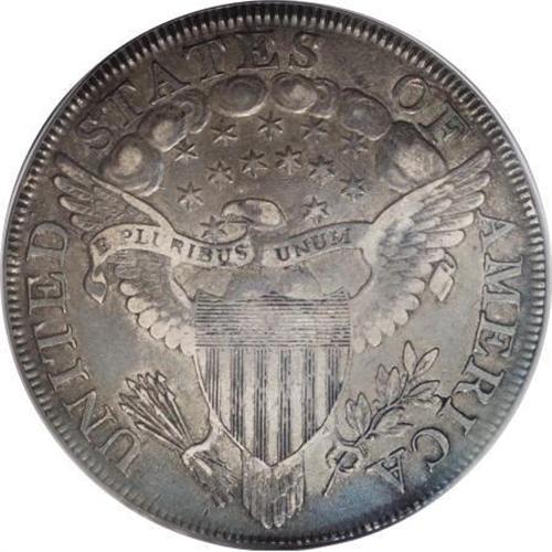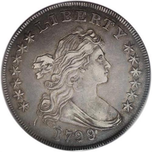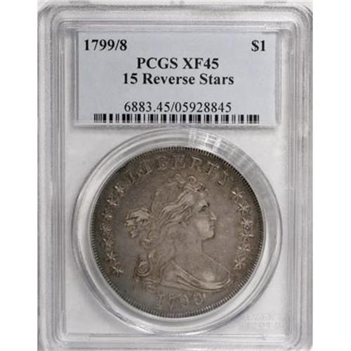 <B>1799/8 $1 15 Stars Reverse XF45 PCGS.</B></I> B-3, BB-141, R.3. The overdate obverse combined with the 15 Stars reverse is sufficient to identify the B-3 die marriage. This lovely piece has fully original steel and gray-brown toning with traces of lighter silver color on the design highpoints. A small nick by the lowest curl is the only noticeable imperfection.<BR><BR><B>Coin Engraver:</B> Robert Scot<BR><BR><b>Shipping:</b> Coins & Currency (<a target="_blank" href="http://www.heritageauctions.com/common/shipping.php">view shipping information</a>)