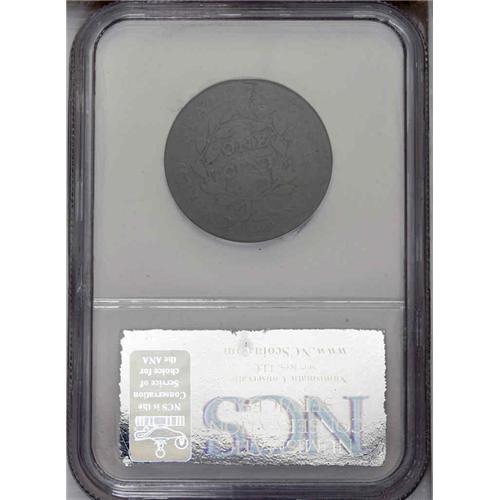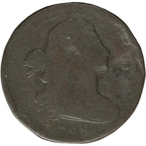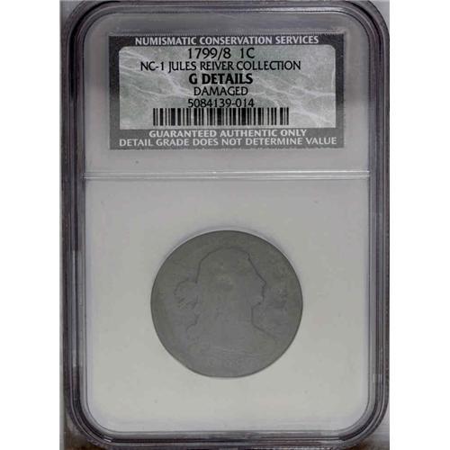 <B>1799/8<1C> NC-1, B-1, R.7--Damaged--NCS. Good Details. Fair 2 EAC.</B></I> Even though the obverse has heavy dents, scrapes, and rim bruises, the lovely medium brown color helps to diminish the appearance of the damage. One of the rim bruises is located directly below the date, obliterating the bottoms of 179, the final digit and the overdate are fully visible and complete. Several attribution points are clearly visible on the reverse. The lowest inside berry is on a short stem, the bottom of C in CENT is blunt and squared, and the pair of leaves above E in ONE has a stem.<BR> Although this variety has been known for nearly 60 years, having been discovered by Dr. Sheldon in the Frederic Geiss Collection (B. Max Mehl, 2/1947), only eight examples have been located to date. Years of discovery for the eight known examples were 1947 (still the finest known), 1958, 1972 (this example), 1977, 1992, 1995, 1997, 1999. This data tells us two things: first, the opportunity to cherrypick an example is highly unlikely, and second, many more people are searching for this variety now than ever before, with half of the known population discovered in the last 14 years. If you have been unsuccessfully searching for an unattributed example for your collection, you may wish to consider this coin from the Reiver Collection. It was the third example to be discovered and has a respectable pedigree of characters.<BR><I>Ex: Lawrence A. Nilson (1/7/1972); Robinson S. Brown, Jr.; Denis W. Loring (5/1974); Dr. Robert J. Shalowitz; John W. Adams; Kagin's (1/1975), lot 479; John W. Adams (6/11/1976); Philip Van Cleave (Kagin's, 2/1/1986), lot 5205.</B></I> Envelope Included.