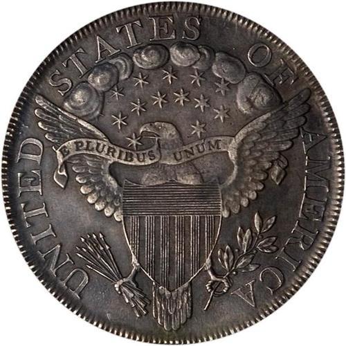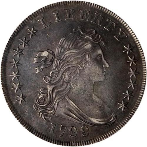<b>1799/8 Draped Bust Dollar. 13 stars on reverse. BB-142. NCS graded About Unc Details. Improperly Cleaned.</b> Clear overdate with minor rust points from the die to the left of the 1 in the date, characteristic of this obverse. The devices were struck with such force and energy by the dies on the hand-operated press that struck this large silver coin that all design elements show boldly including the stars. This is an impressive early silver dollar, no doubt about it. Dark gray patina that is smooth, with only a few light marks on Liberty's face and bust, and in the nearby field. The reverse is uniformly dark gray with no marks to speak of <b>(PCGS # 6884)</b>