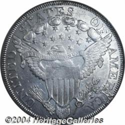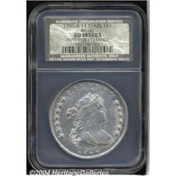 <B>1799/8<S$1> 13 Stars Reverse AU50 Details, Improperly Cleaned, NCS.</B></I> B-1, BB-142, R.2. Die State III. A subdued and untoned example that does not have prominent hairlines or adjustment marks. The eagle's breast displays light wear, but the devices are generally bold and retain substantial luster. A few slide marks near the mouth and a minor ding on the reverse rim at 3 o'clock do not distract. A late die state with a notable mint-made break near the I in AMERICA.<BR><I>From The Karl Scheible Collection.</B></I> <BR><BR><B>Important notice:</B> Heritage usually auctions material at the rate of 200-250 lots per hour. On some occasions eBay Live bid software or the Internet may not be able to keep up with the pace of the auction. We recommend placing a realistic absentee bid now as insurance to avoid disappointment. Occasionally the auctioneer may eliminate or reject an eBay Live bid, and the auctioneer may also reopen a lot after the close of the eBay live bidding (usually because we missed an audience bid), and may reject your bid even if it shows you as the winning bidder. By bidding via eBay Live, you agree that Heritage may award the lot to another bidder at its sole discretion under the circumstances described above or any other reasonable circumstances. Since eBay bids are not shown to us until we open the lot on the floor, we treat those bids just like floor bids. In most cases the floor responds before the eBay bid is presented to us, due to Internet lag time, so for consistency we have made it a policy that floor bids are always considered first over tie eBay live bids. Also please note that all Heritage lots purchased through eBay Live carry a 20% Buyer's Premium. Please make sure you read the Terms and Conditions before you bid. </span></font></tr></table></td></tr></table>