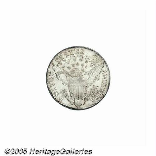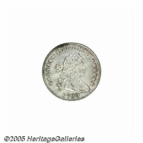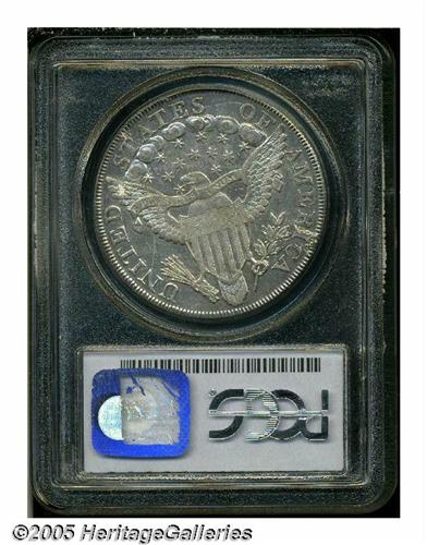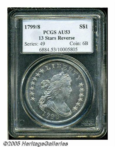 <B>1799/8<S$1> 13 Stars Reverse AU53 PCGS.</B></I> B-1, BB-142, R.2. Die State II. A very good strike with most of the stars sharp and with full definition on the wing feathers. The surfaces have a few light slide marks from brief circulation. There are no mentionable abrasions. The first 9 in the date is repunched, and the second 9 has an obvious underlying 8. A crumbling reverse die (as struck) affects the RIC in AMERICA. Population: 11 in 53, 22 finer (6/05).