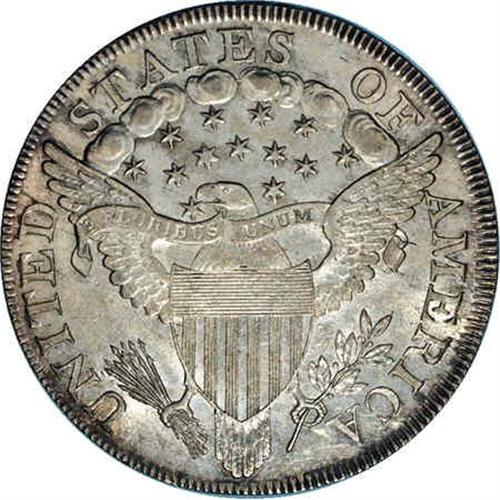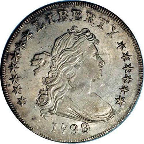 <B>1799/8<S$1> Overdate, 13 Stars. B-2, BB-143, R.3. AU58 NGC.</B></I> Overdate; 13 Stars, leaf point below left upright of I. Reiver die state a. Bowers-Borckardt die state I. This is the Reiver plate coin for the reverse of this variety. A frosty and lustrous coin that shows excellent surfaces and attractive light gold toning. For this variety, this is certainly near or within the Condition Census. A single obverse die was used for the overdates of 1799, that die being paired with three different reverse dies. This particular issue is more elusive than the other two, and is particularly difficult to find so close to mint condition.<BR> The obverse is very sharply struck for this variety with strong definition on Liberty's curls. Examination will note that the obverse die was lapped, with the lowest curls on Liberty shallow and the curl closest to the first star is disconnected from the rest of Liberty's hair. Weak dentils below the date, probably from the die lapping. Bold on the overdate feature, and no attempt was made to efface the undertype 8 below the second 9 in the date. The obverse die shows various die lumps below the ERT of LIBERTY. On the reverse, a thin die crack is seen from the rim to the outer curve of the D in UNITED, with additional small die lumps seen scattered about. A wonderful coin to represent this variety, and with a great pedigree to boot.<BR> Described in the Superior catalog as "About Uncirculated 50 or so, the reverse nicer than the obverse and with a fully lustrous cartwheel effect. Obverse rubbed on forelock and has many small handling marks. Finest we have seen and extremely rare Extra Fine or better."<BR><I>Ex: Col. E.H.R. Green; K.P. Austin; Superior's ANA Sale of the Jacque and A.J. Ostheimer Collection (August, 1975) lot 910.</B></I> Envelope Included.