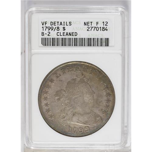 <B>1799/8<img border='0' src='http://www.heritagecoins.com/images/star.gif' width=10 height=10>$1> 13 Stars Reverse--Cleaned--ANACS. VF Details, Net Fine 12.</B></I> B-2, BB-143, R.4. Partially retoned in brick-red, peach, and blue. A very scarce piece with positive eye appeal.