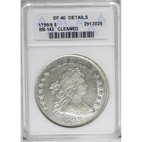 <B>1799/8 S$1 13 Stars Reverse--Cleaned--ANACS. XF40 Details.</B></I> B-1, BB-142, R.4. A very scarce variety, represented here by a shiny pearl-gray example that has light tan toning over parts of the obverse. The prominent diagnostic die break appears at the I of AMERICA.<BR><I>From The Jones Beach Collection.</B></I><BR><BR><b>Shipping:</b> Coin/Currency (<a target="_blank" href="http://www.heritageauctions.com/common/shipping.php">view shipping information</a>)